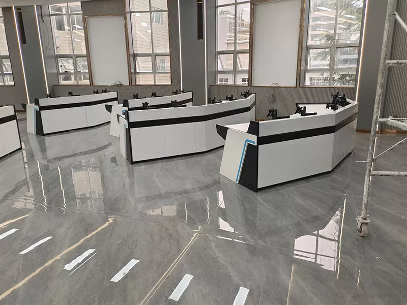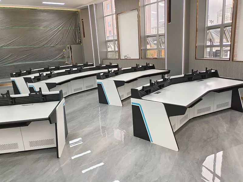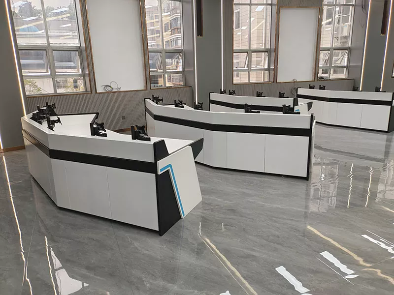 Denna kontrollpanel löser inte bara problemet med begränsad drift i samband med traditionella linjära kontrollpaneler utan har också väldesignade kabelhanteringskanaler och ventilationsutrymme, som enkelt organiserar stökiga kablar, underlättar effektiv värmeavledning och skapar en renare och mer organiserad övervakningsrumslayout. Dess robusta struktur kan stabilt stödja flera monitorer och kringutrustning utan att oroa dig för att utrustningen skakar eller deformeras, vilket säkerställer en långsiktig stabil drift och minskar framtida underhållsproblem.