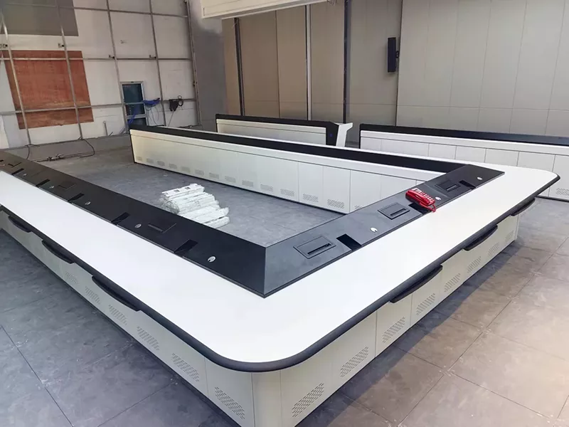 Temei Rui U-formad övervakningskonsol är designad och tillverkad av en professionell övervakningskonsoltillverkare och fabrik i Kina. It adopts an innovative double-cantilever hollow U-shaped structure, breaking through the visual and spatial limitations of traditional enclosed consoles, and providing the command center with an unobstructed, wide-angle monitoring field of view.